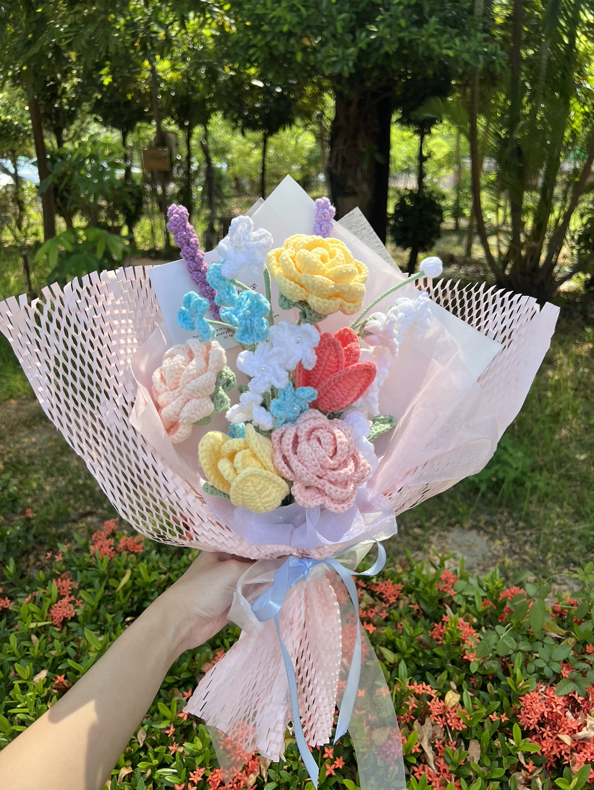一束有5朵小玫瑰、5朵勿忘我,花朵配置為愛心形狀,搭配透明感包裝,情人節閉眼買就對啦💓