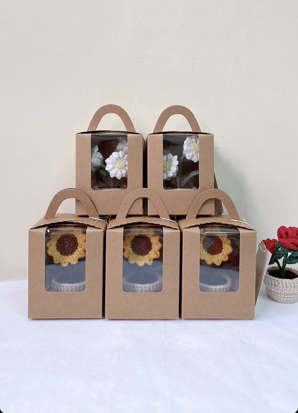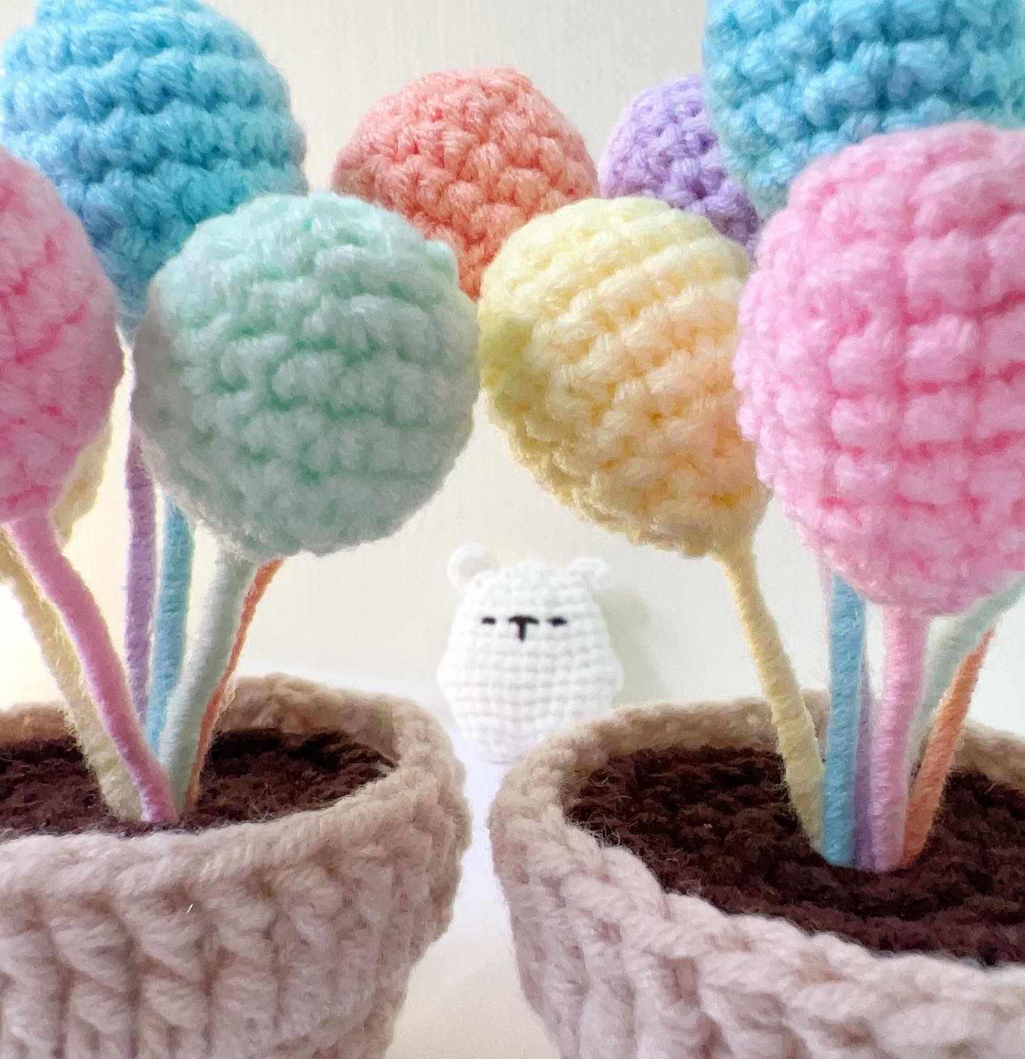 從花朵到盆栽整體都使用毛線編織,手感柔軟扎實;氣球可更換顏色。